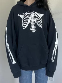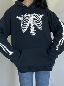 Women’s Spring Autumn Hoodies Skull Print Long Sleeve Hooded Sweatshirt Pullover Tops Punk Gothic Y2K Clothes