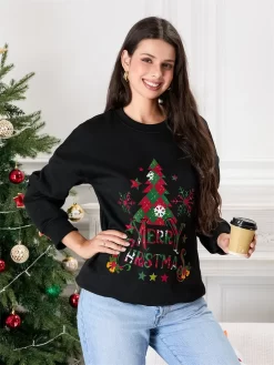 Women Cute Sweatshirts Christmas Tree Letter Print Long Sleeve Pullovers Casual Fall Workout Tops Autumn Streetwear