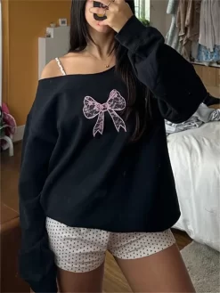 Women Off-Shoulder Sweatshirts Cute Print Loose Long Sleeve Pullovers Casual Fall Workout Tops Autumn Streetwear